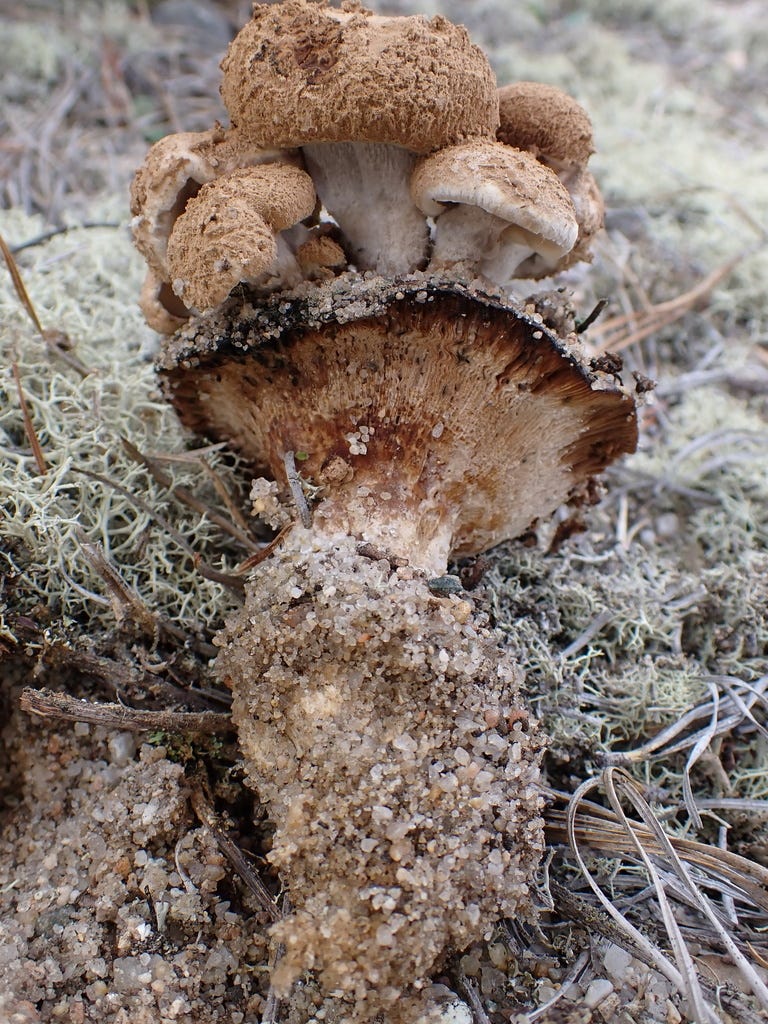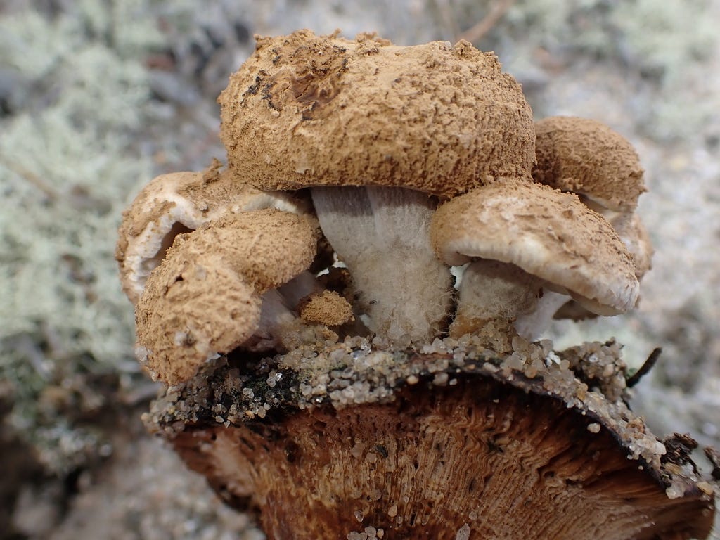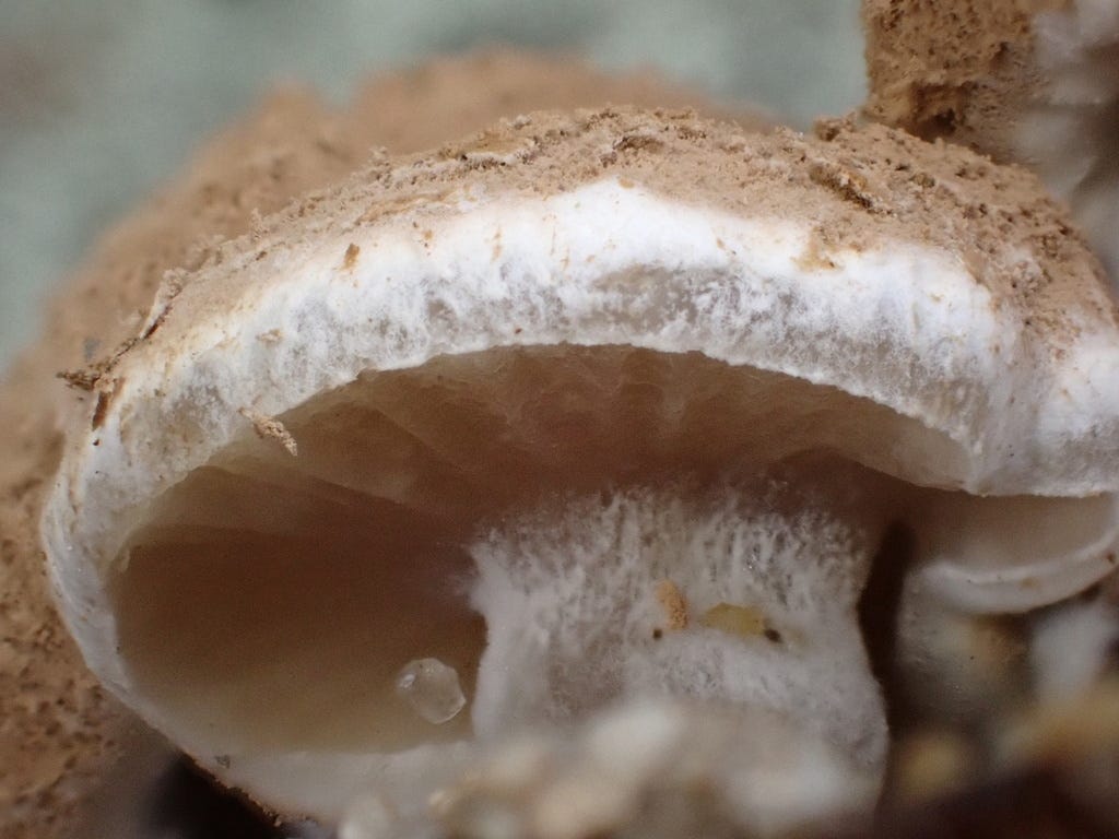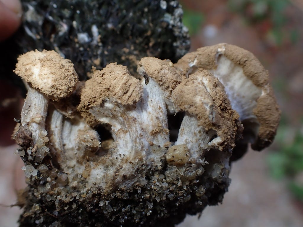 The DNA confirmation of this species was helpful to confirm which species we have on the Cape, but to our knowledge, there are only two species in the genus Asterophora. A coin-flip from the jump. Better yet, the two actually appear to be distinguishable in the field. The sister species, Asterophora parasitica, doesn’t produce the powdery chlamydospores on the cap and also has fully developed gills.