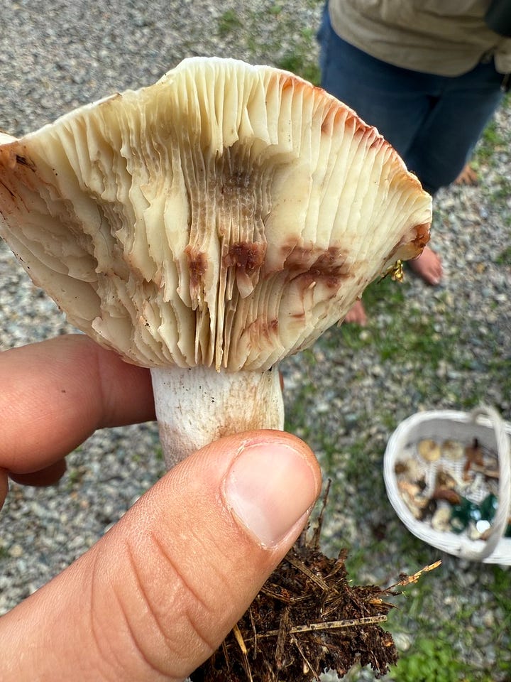 The host Russula dissimulans is a large, white Russula that bruises red, but then that red fades to black. When the mushrooms are older, they turn all black, and that’s when the powder caps pop up.